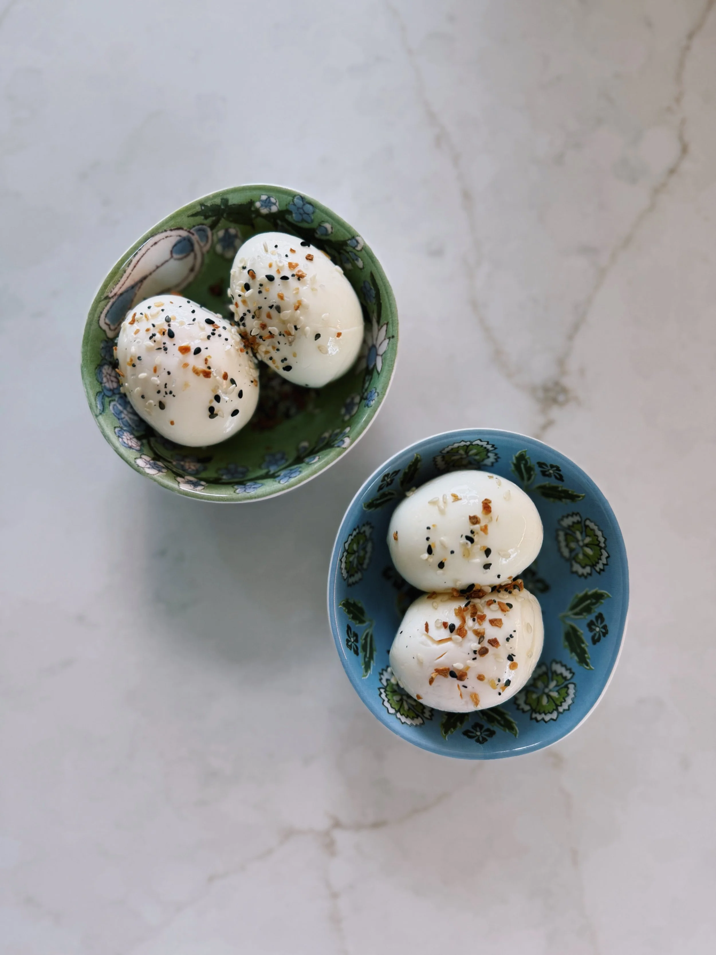 • Hard boiled eggs topped with Trader Joe’s everything bagel seed mix
