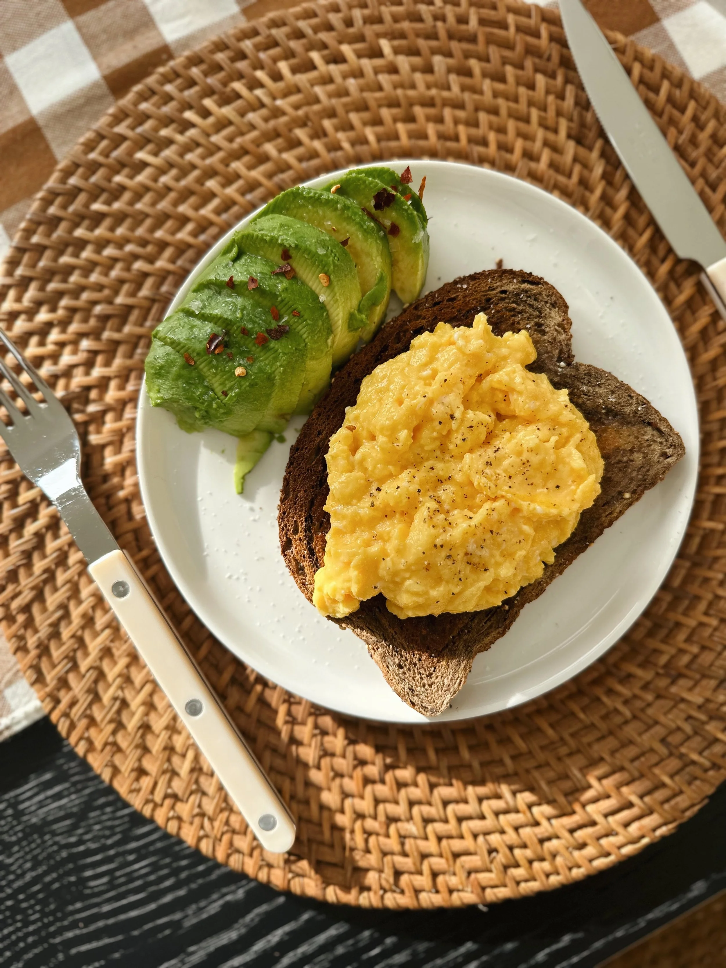 • Scrambled eggs on toast with cracked pepper along side avocado drizzled with olive oil and topped with red pepper flakes