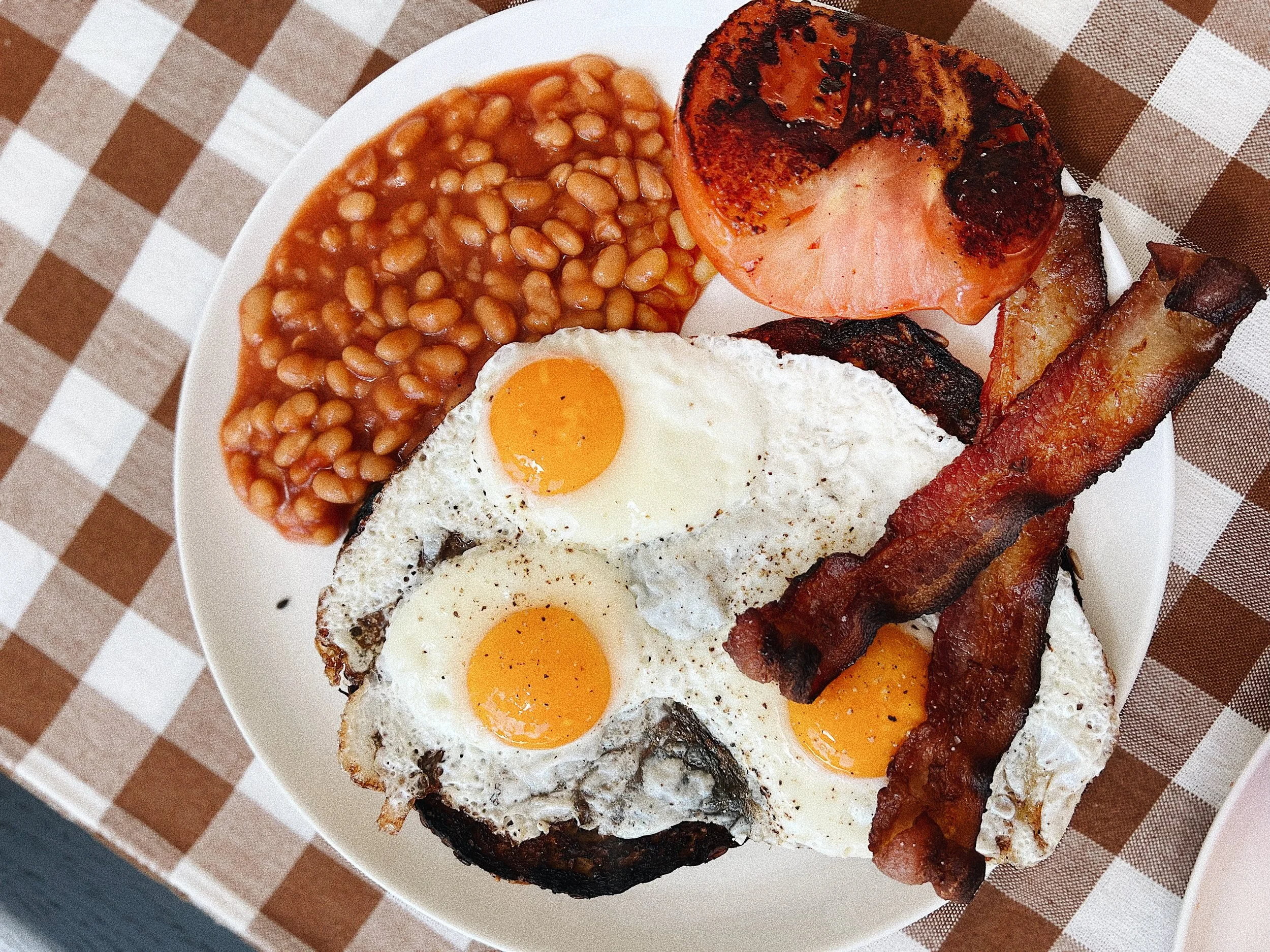 • Full English fry up: sunny side up egg, toast, bacon, toasted tomato and of course beans
