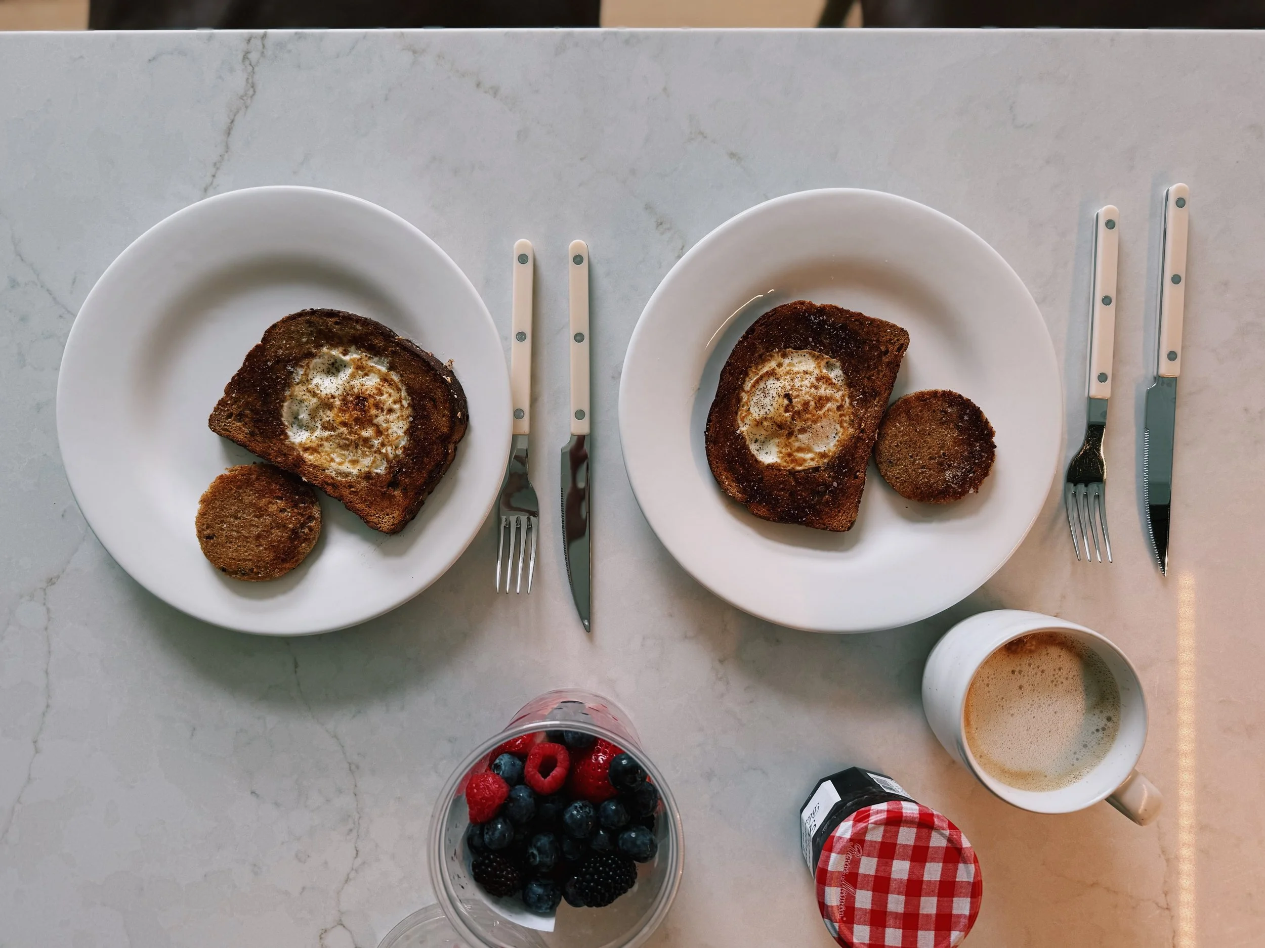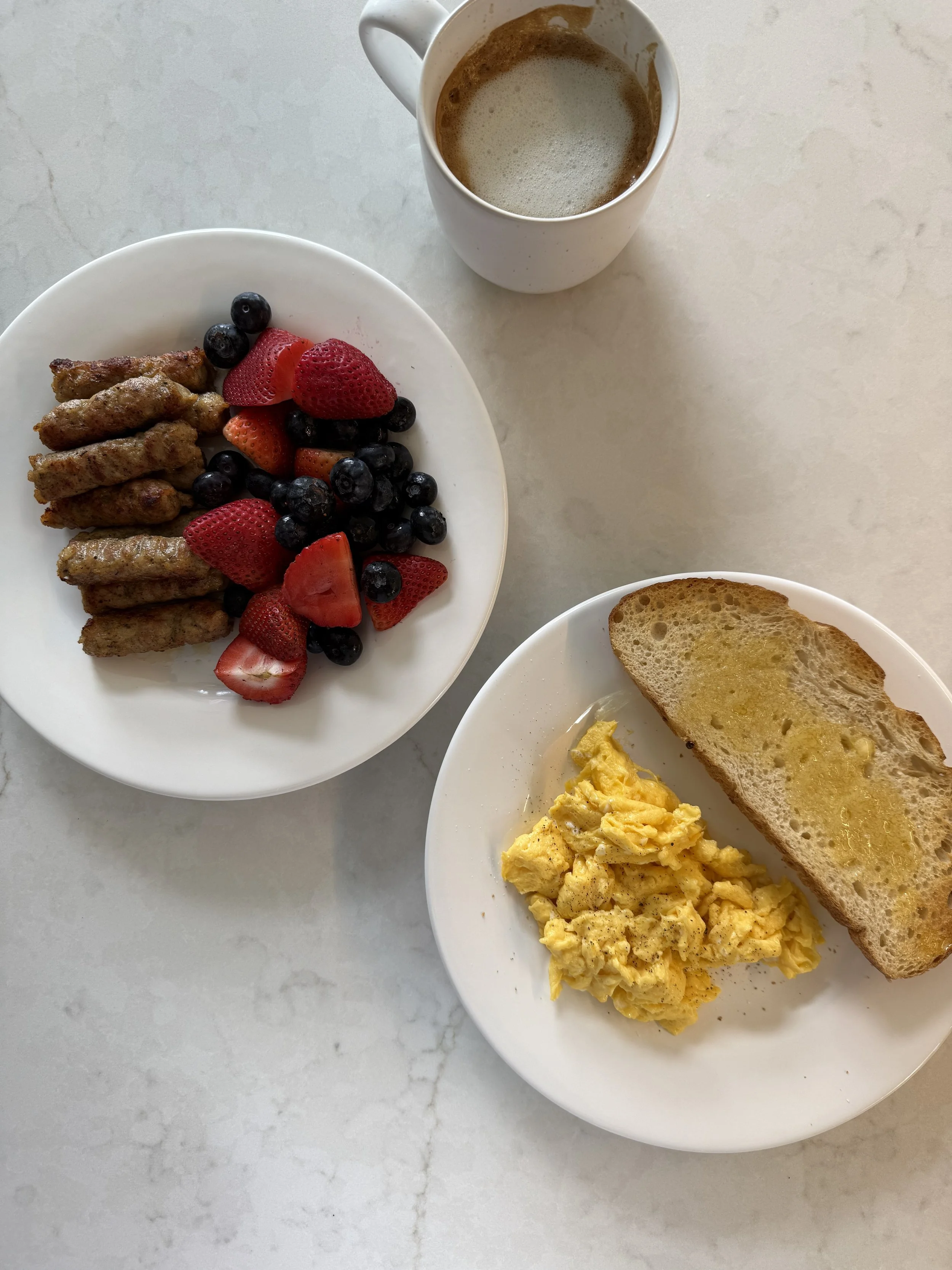 • Scrambled eggs next to toast, adjacent to a plate filled with berries and sausages (frozen, cannot remember the brand) and an oat milk latte off screen.