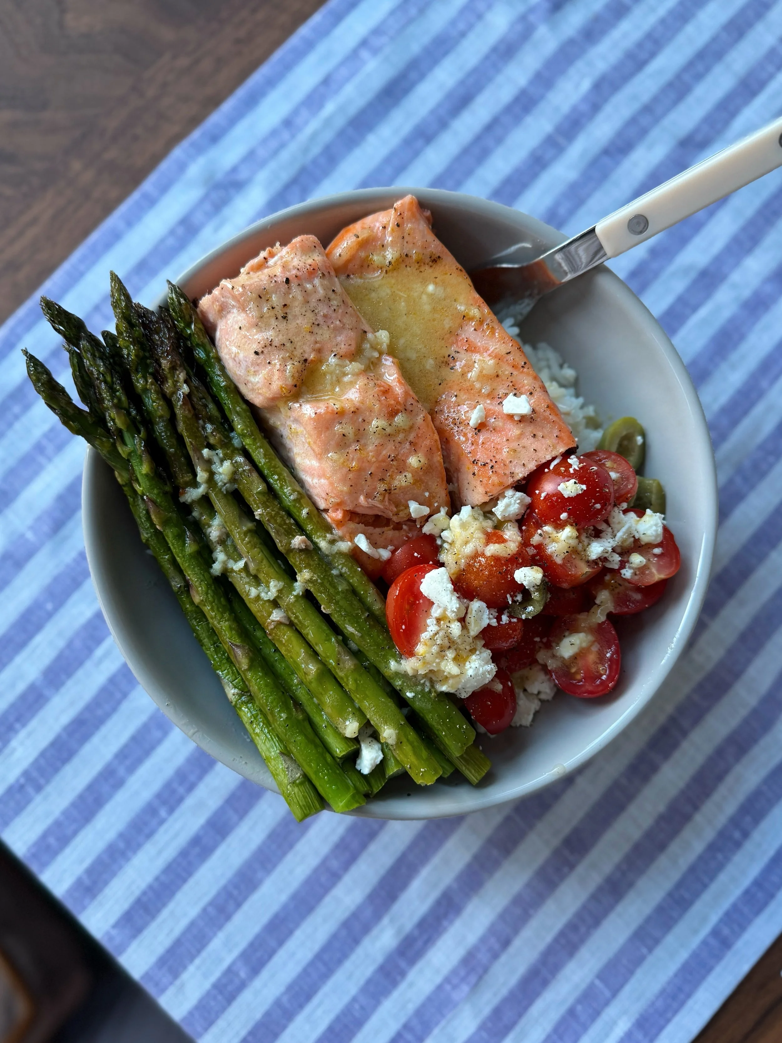 More baked salmon. Baked both @ 425°. Topped with a lemon butter sauce. Added a tomato feta side salad.