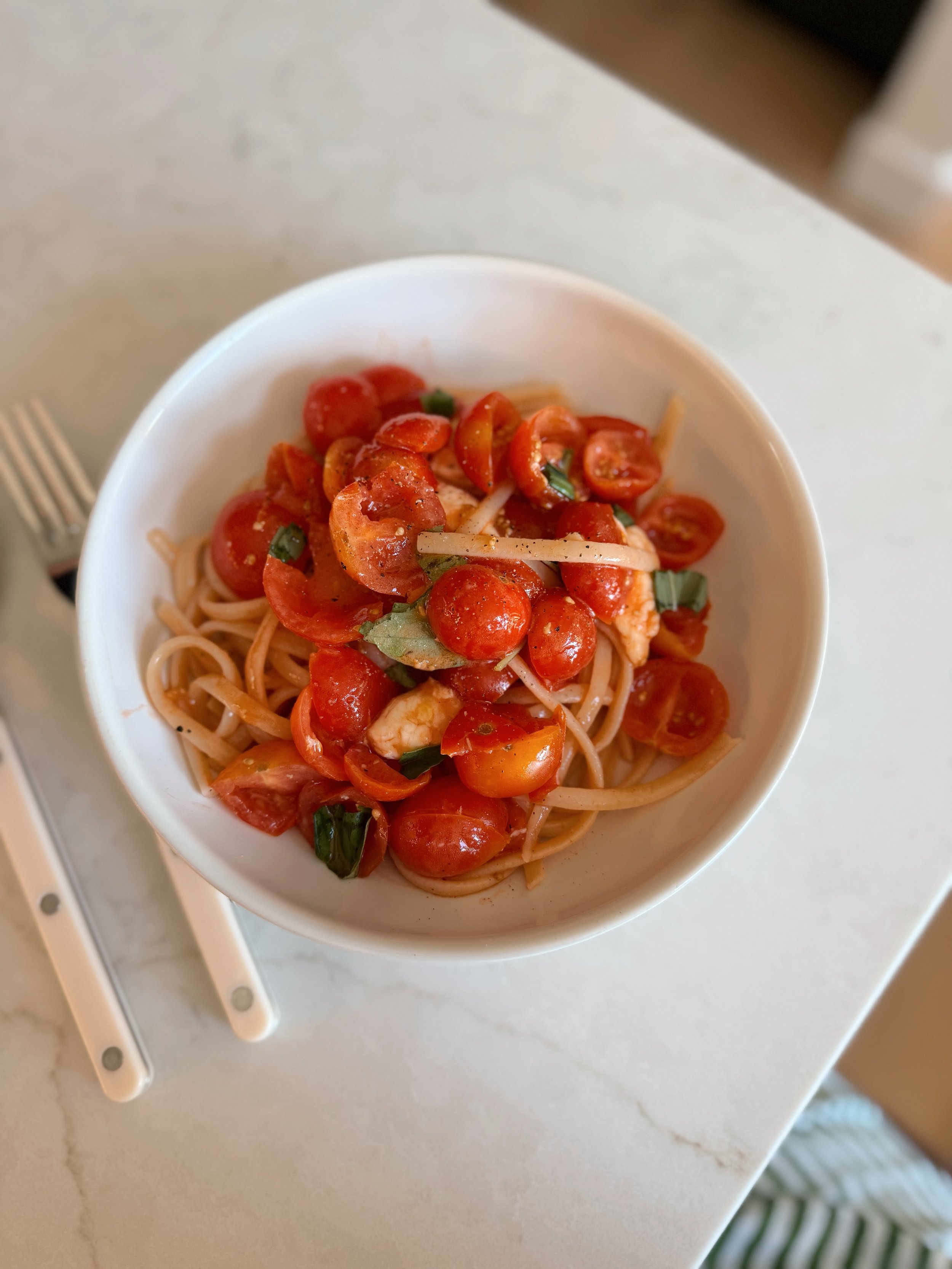 Hot fresh pasta with room temperature tomatoes, mozzarella, oil and basil. Perfect summer lunch.