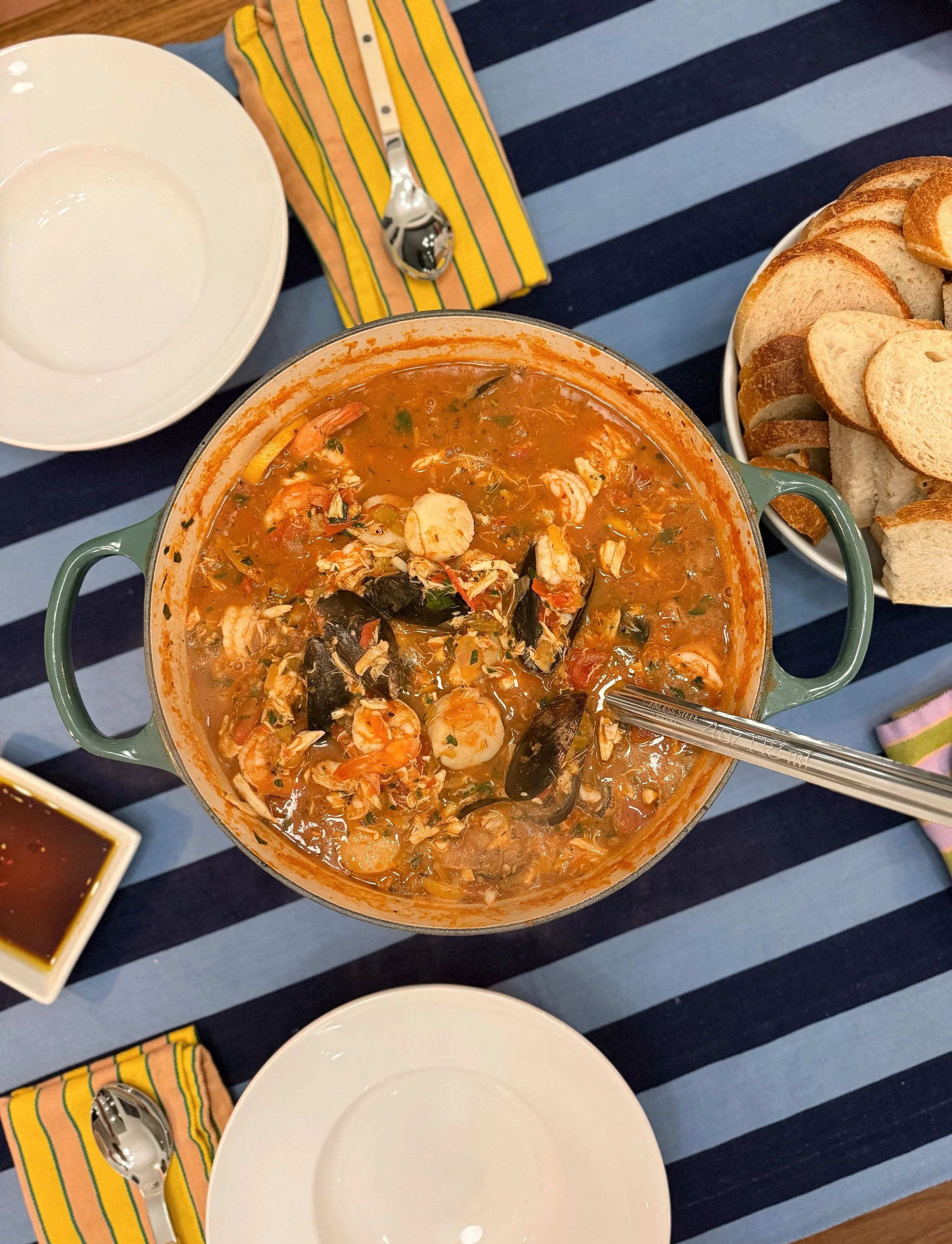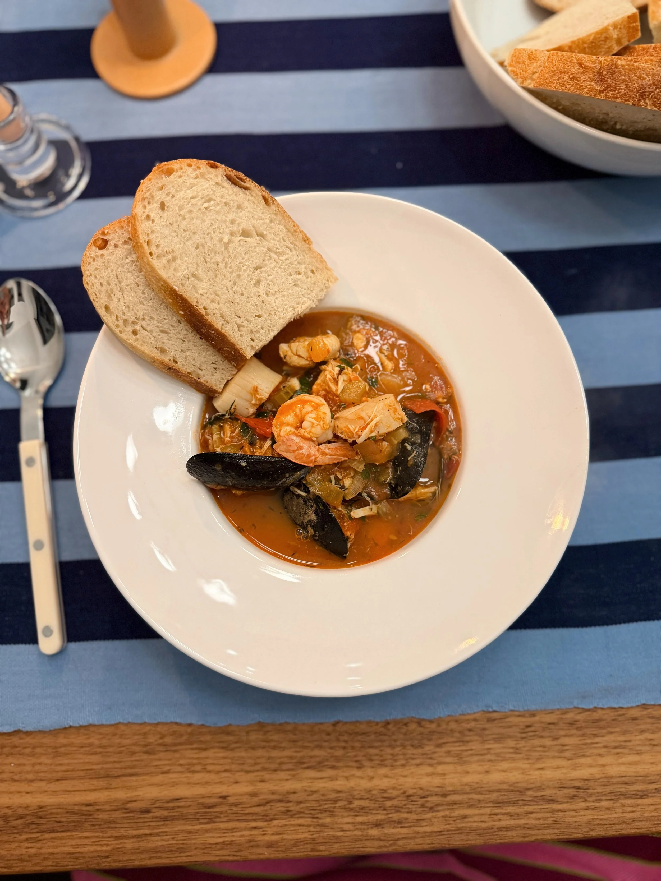 Peach made the Cioppino - no recipe, just all the seafood (scallops, shrimp, halibut, clams, and Iβm sure something else Iβm forgetting). It was acidic, tomato forward and very scrumptious.