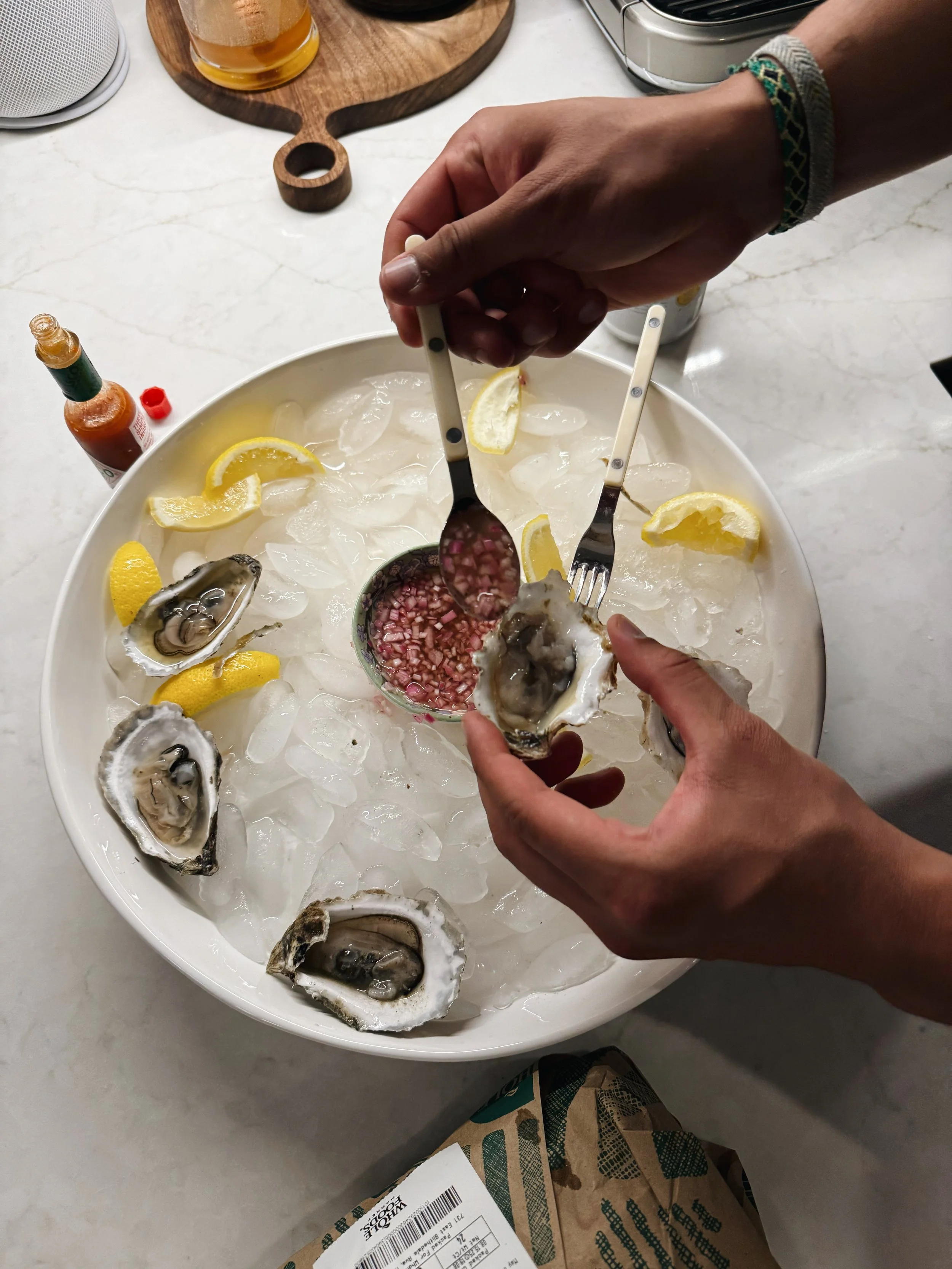 Al bought 4 dozen all different varieties. I wrote none of them down. One batch was questionable so I think we only ended up shucking (and eating) 3 dozen. We served them with a classic mignonette: brunoise shallots + red wine vinegar + salt & pepper