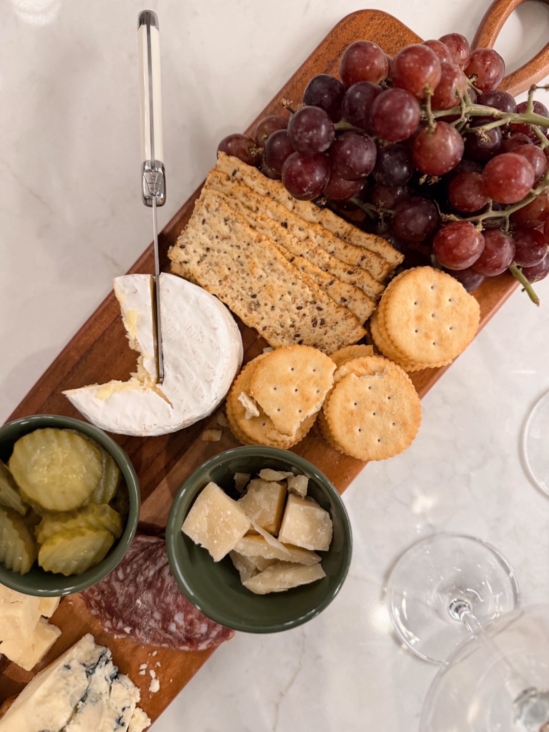 - Cheese board featuring: Cowgirl Creamery Mt. Tam triple cream cheese, roquefort, cheddar, crostini, crackers, and grapes