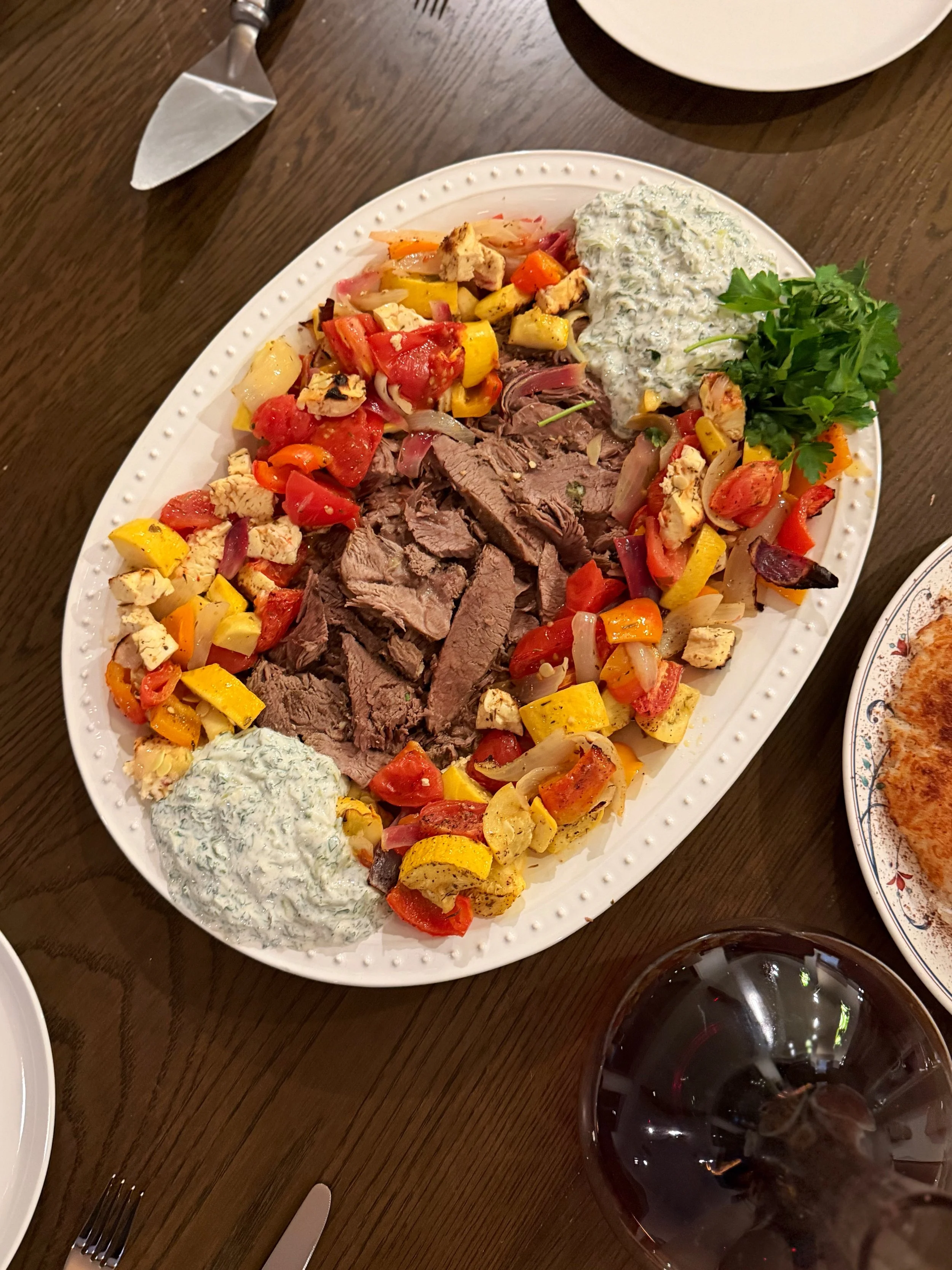 Cooked in a pressure cooker for 90 minutes. Paired with homemade tzatziki and roasted veggies (zucchini, bell peppers and onions). Could eat for every meal - so satisfying and tasty!