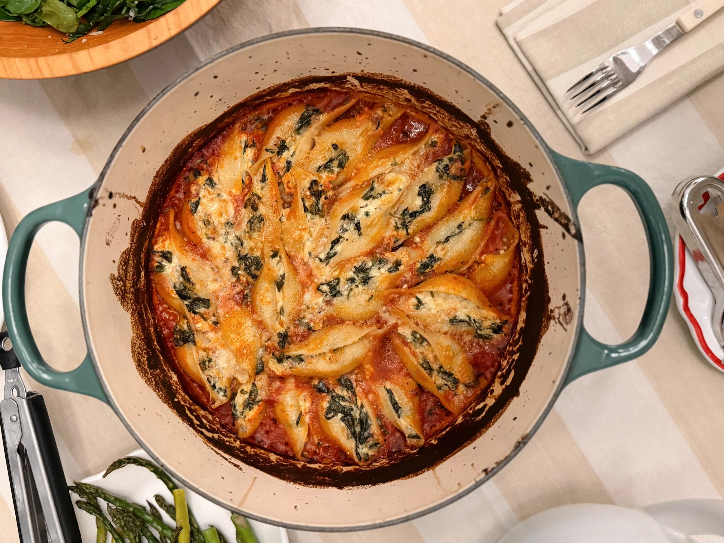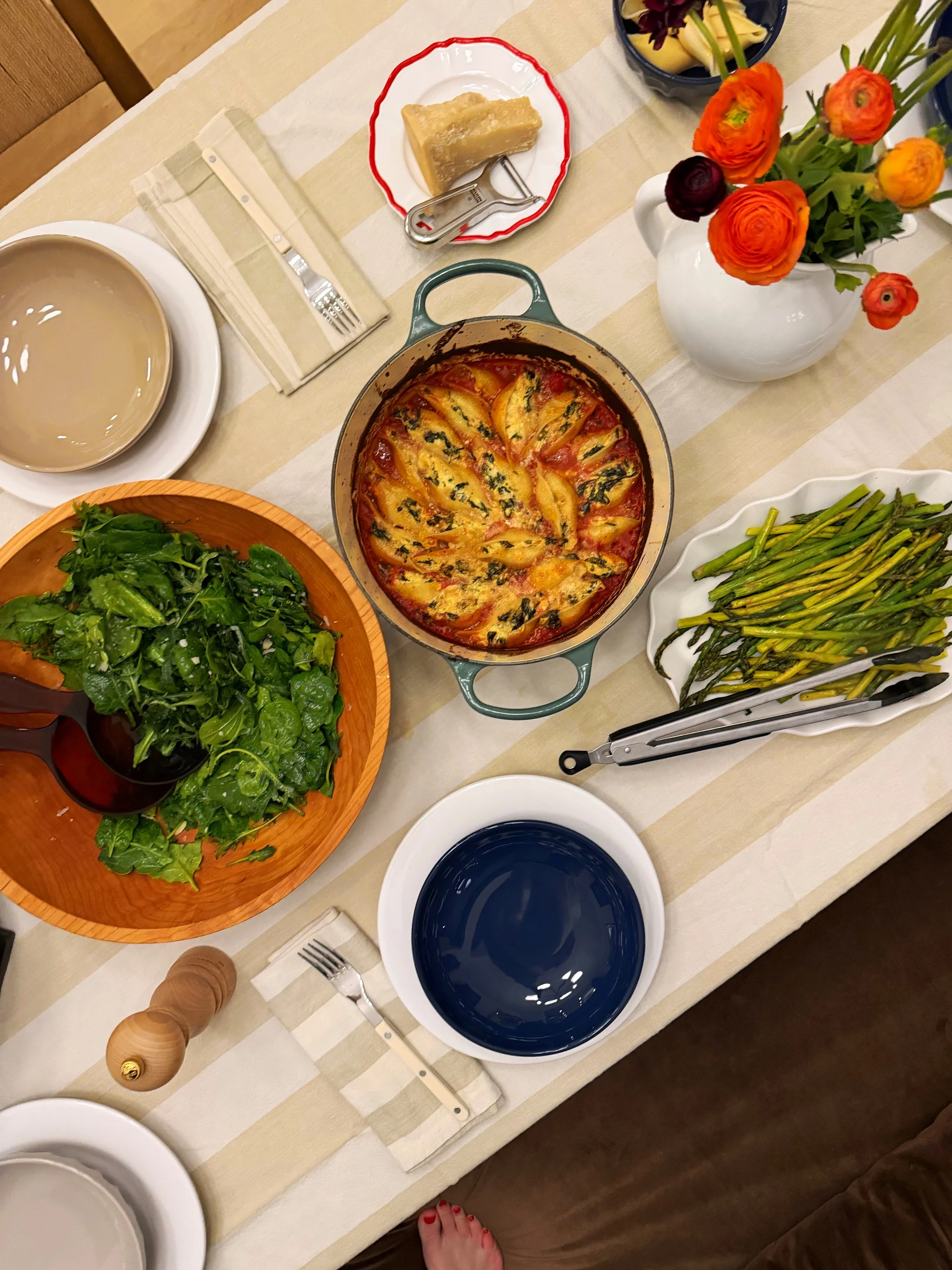 We made stuffed shells this week that were out of this world π The filling was so flavorful (filled with: spinach, prosciutto, Parmesan, homemade ricotta, and other things I cannot remember!) We served it with a whole bunch of greens - roasted asparagus and a spinach & arugula salad. And, for dessert we kept things very classic: chocolate pudding and chocolate chip cookies πͺ