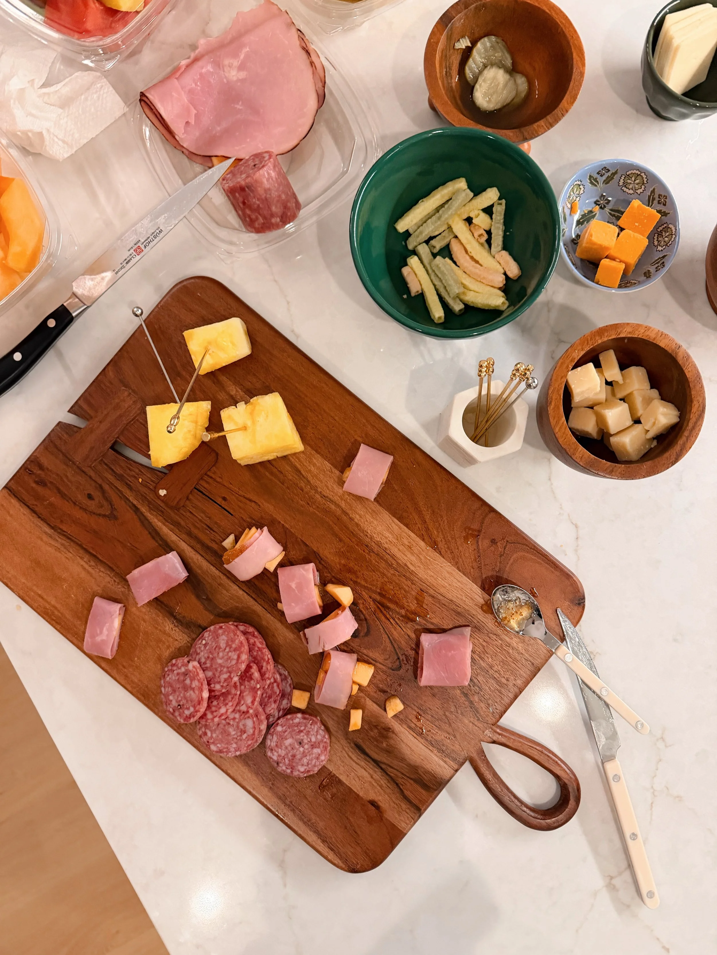 Mark was worried we werenβt going to have enough food π so we called Jake & Peach and asked them to bring extra snacks. Peach got very creative and made us all a fruit wrapped ham snack that was strange in theory, but delicious in reality.