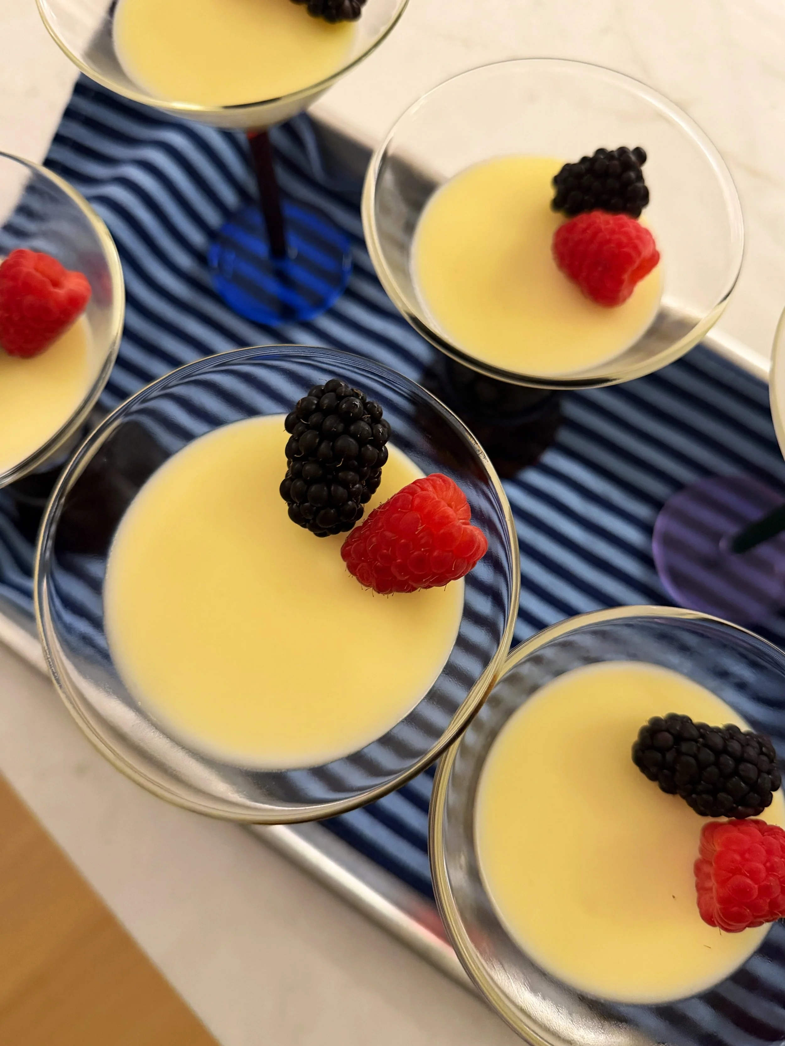 I wanted something light to serve after the fried chicken sandwiches so I made an all time crowd favorite - these lemon possets. Served with Costco berries which are elite.