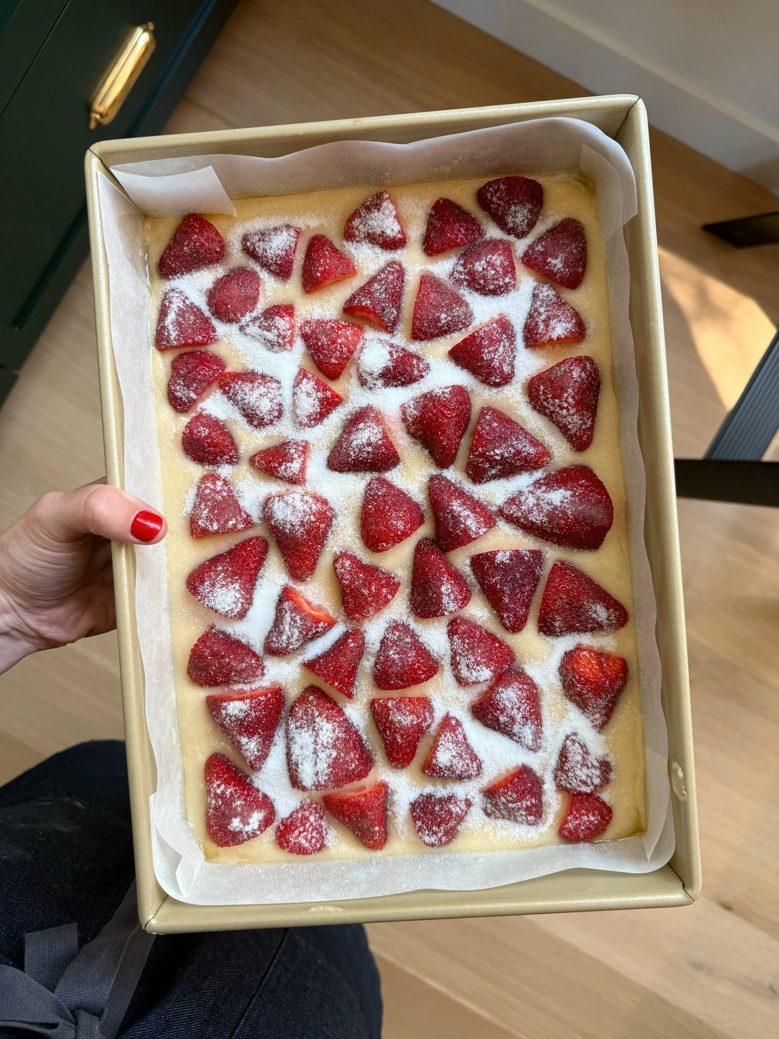 Strawberries are still very much in season and so good! So the strawberry treats will continue - in my opinion, this was way better than the strawberry almond pound cake from last week - and yields way more cake! Also most importantly, it is more focused on the strawberries 🍓 Recipe from Smitten Kitchen