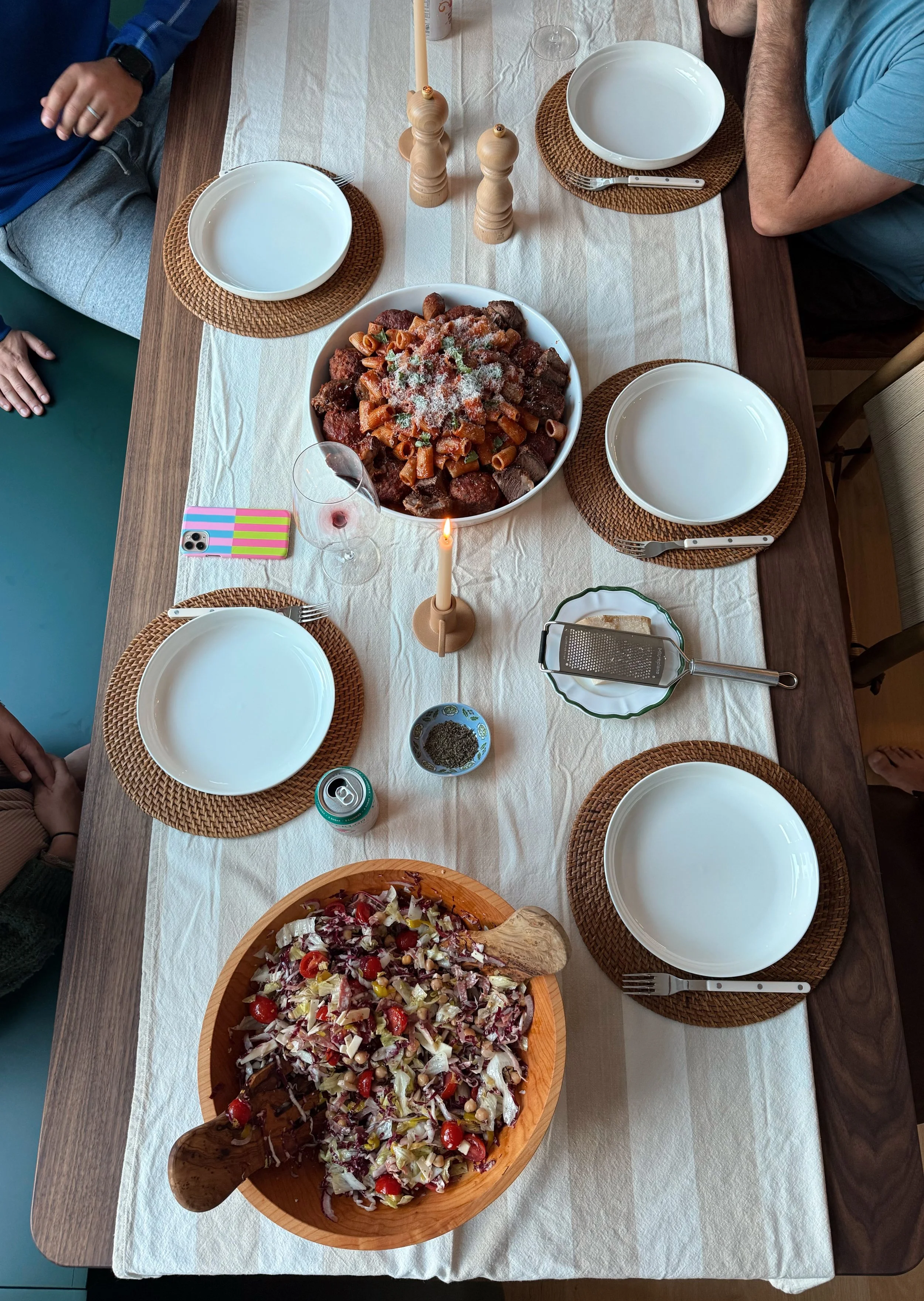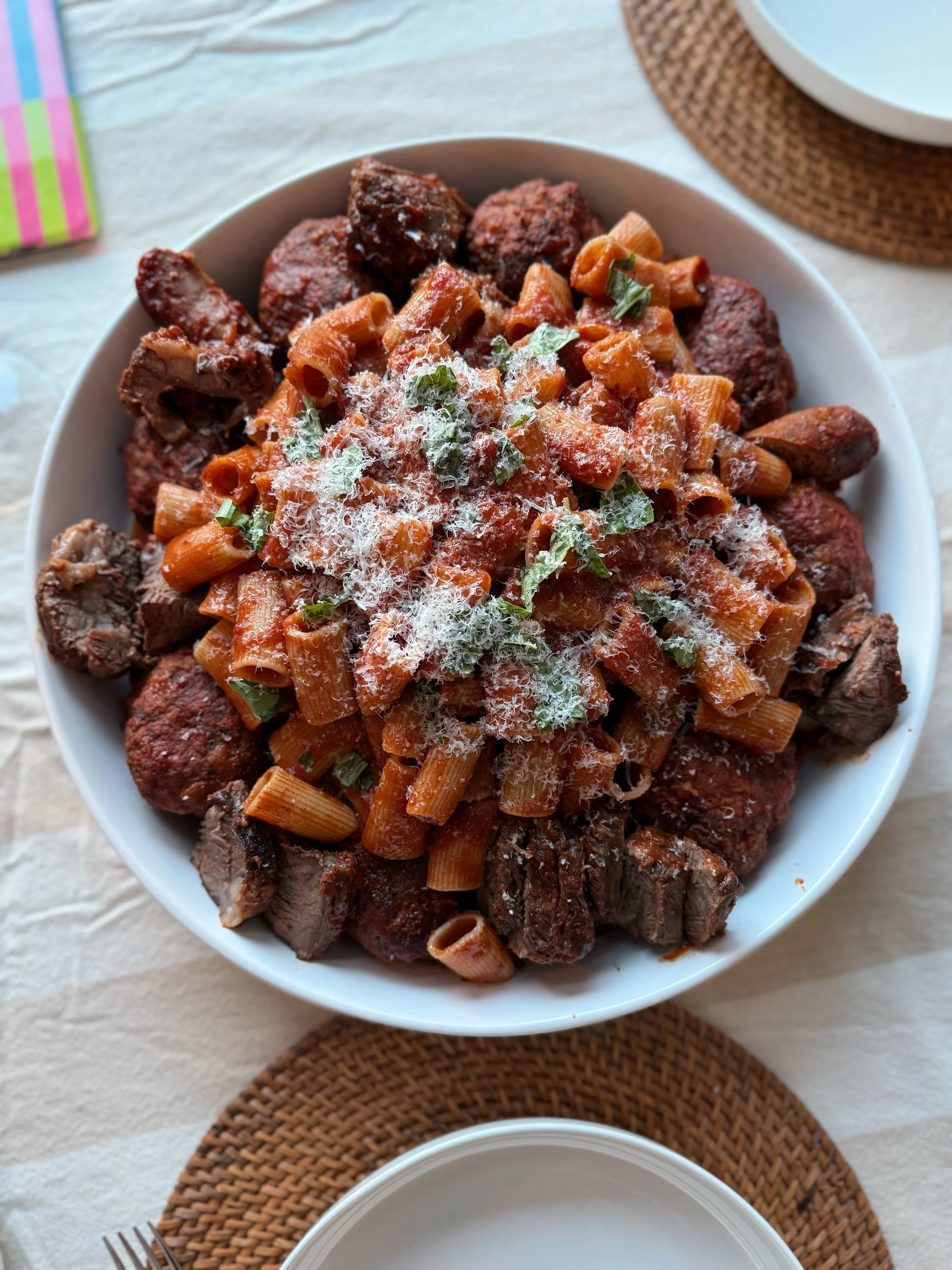 Another Sunday, another gravy. Mark continues to tweak this dish (first featured two weeks ago). Instead of pork chops, we did short ribs this time, and instead of mild Italian sausage we went hot ๐ฅ The sausage was incredible, the short ribs needed more time. And as always, Grandma Lucilleโs meatballs were absolutely perfect.