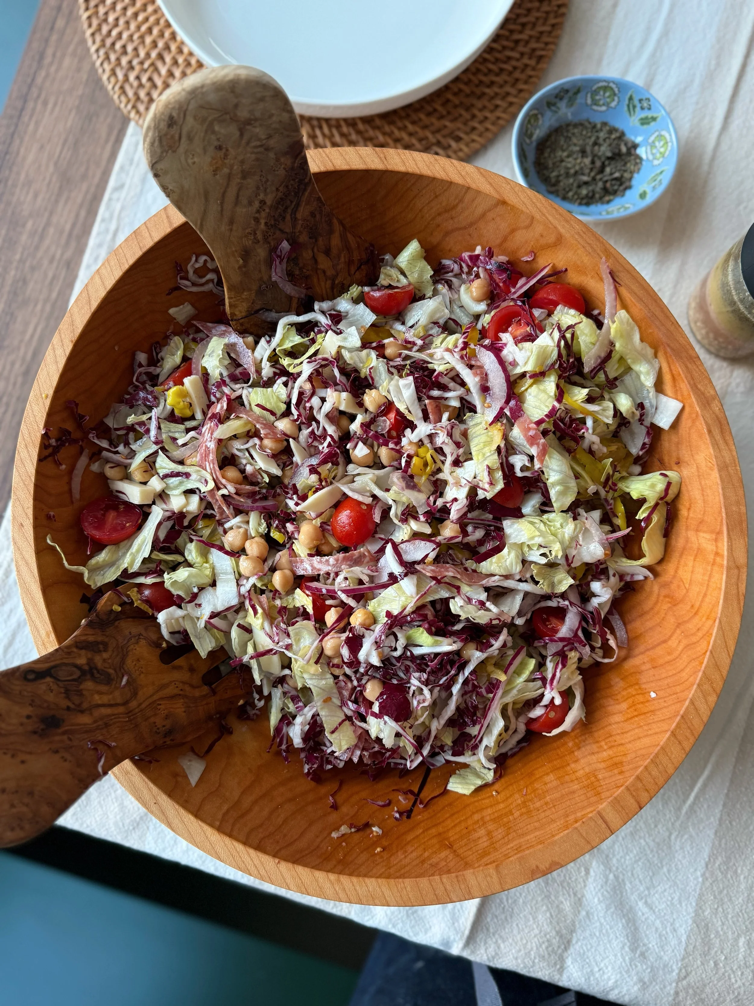 To quote Jake, โthis is like an entire Italian hoagie, in a salad.โ Yes, Jake. YES! Recipe from Nancy Silverton (and her cookbook Mozza). The salad features iceberg lettuce, radicchio, salami, provolone, cherry tomatoes, red onions, peperoncini, chickpeas, and a garlic, oregano forward vinaigrette. The recipe calls for Sicilian oregano - so of course we obliged, and it was so fragrant and worth it. We topped everything at the table with it!