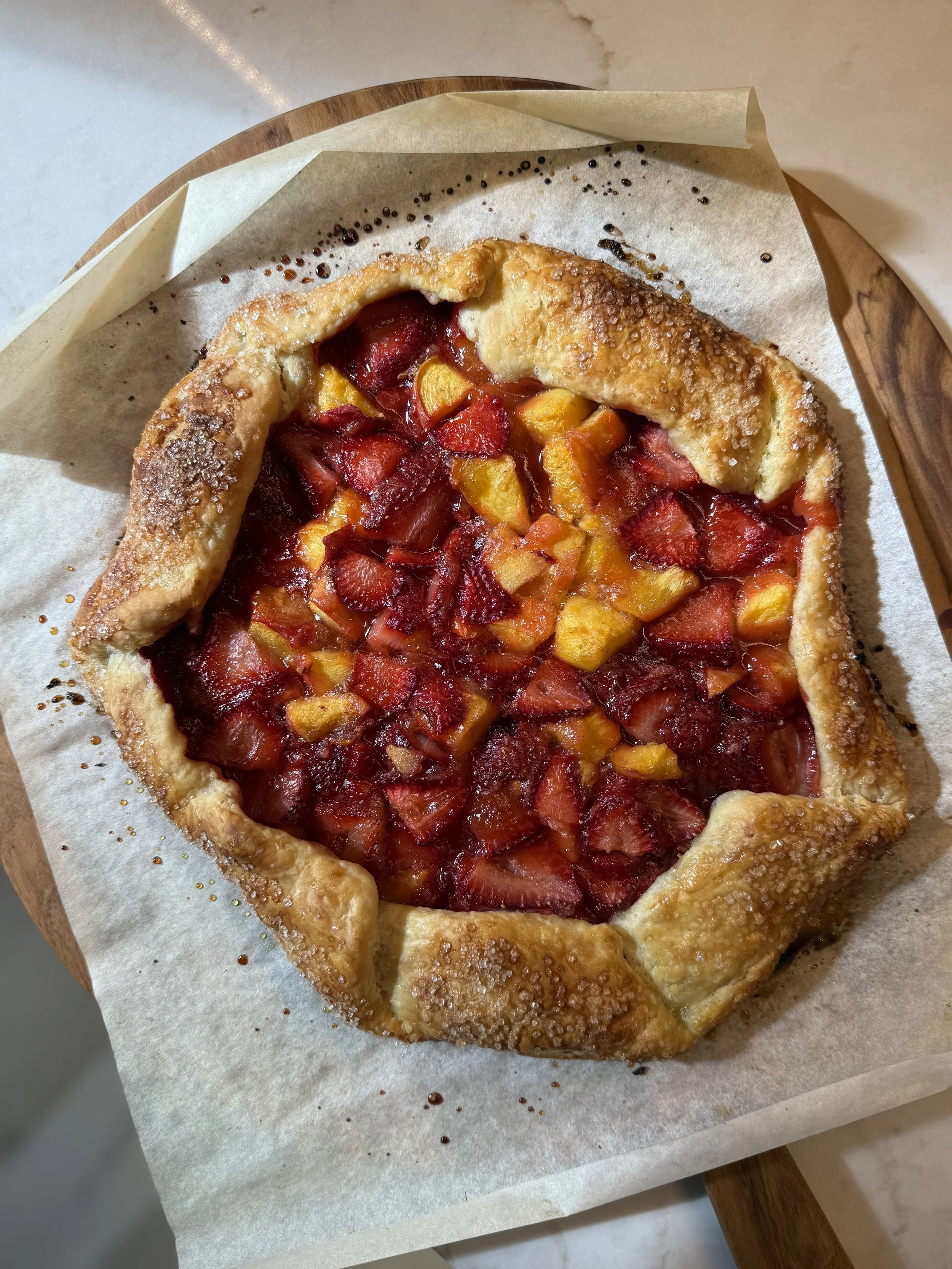 The strawberries are still in season and speaking to me. Every farmerโs market I go to (and boy do we have a lot in Mill Valley) they are still sparkling red and juicy - and the same was true with the peaches this week. So as long as they continue to be that perfect, I will continue to cook with them. Crust dough was inspired by this Smitten Kitchen dough, but I used sour cream instead of ricotta since thatโs what I had in the fridge. Topped with my King Arthur Sparkling Sugar.