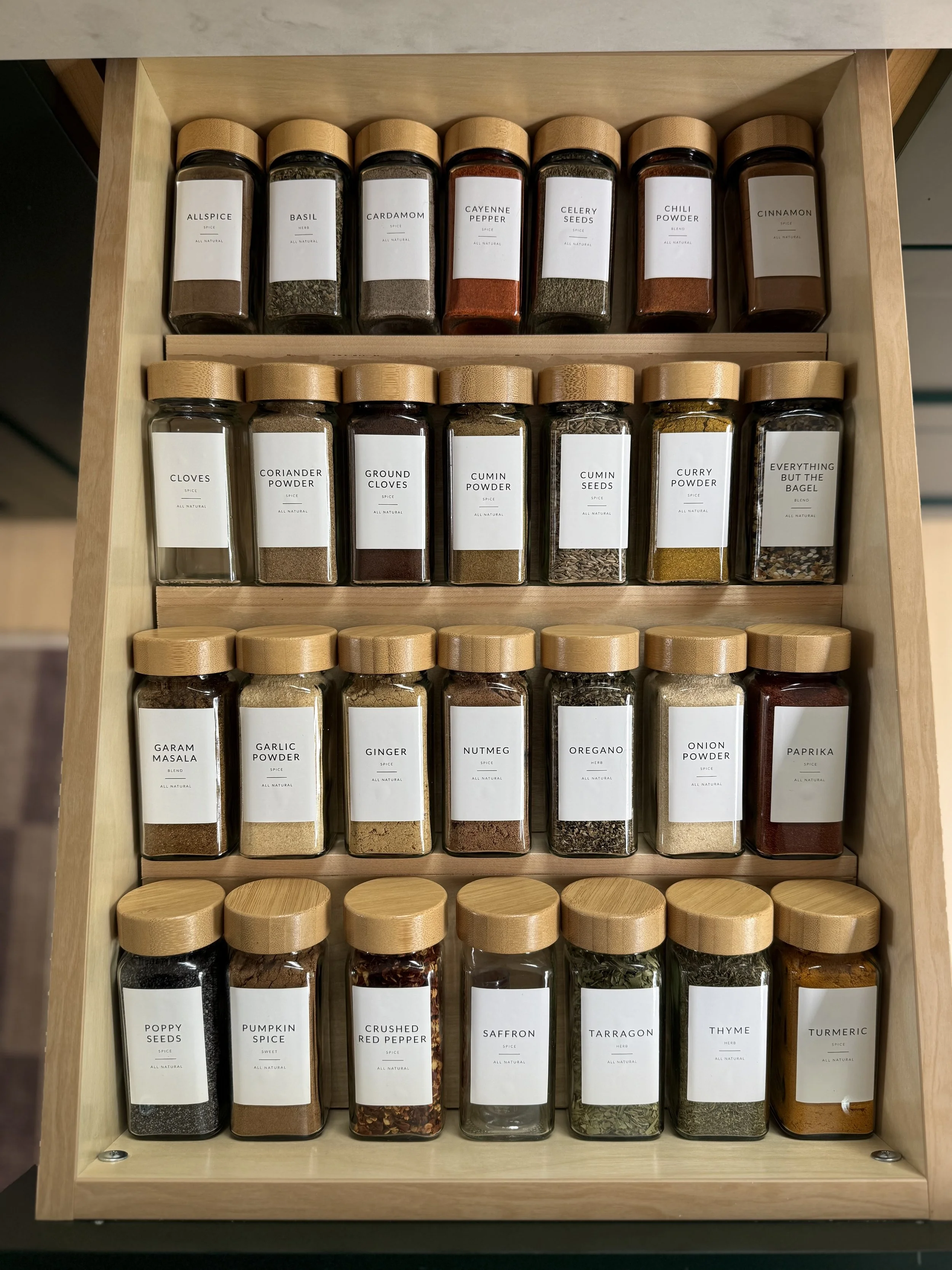 In kitchen adjacent news, Mark and I recently updated all of our spices - we are now a Morton & Bassett family. After a few flavorless, dull, and questionably cheap spices from Whole Foods we decided to invest in a higher quality, more consistent product. These spices are all so much more pungent, and aromatic. I am very pleased with this upgrade - but the one downside to this life change was that the jars were slightly larger than the Whole Foods spice jars and no longer evenly fit in our spice drawer. So I am (too) thrilled to share we also invested in new (air tight) jars with custom labels.