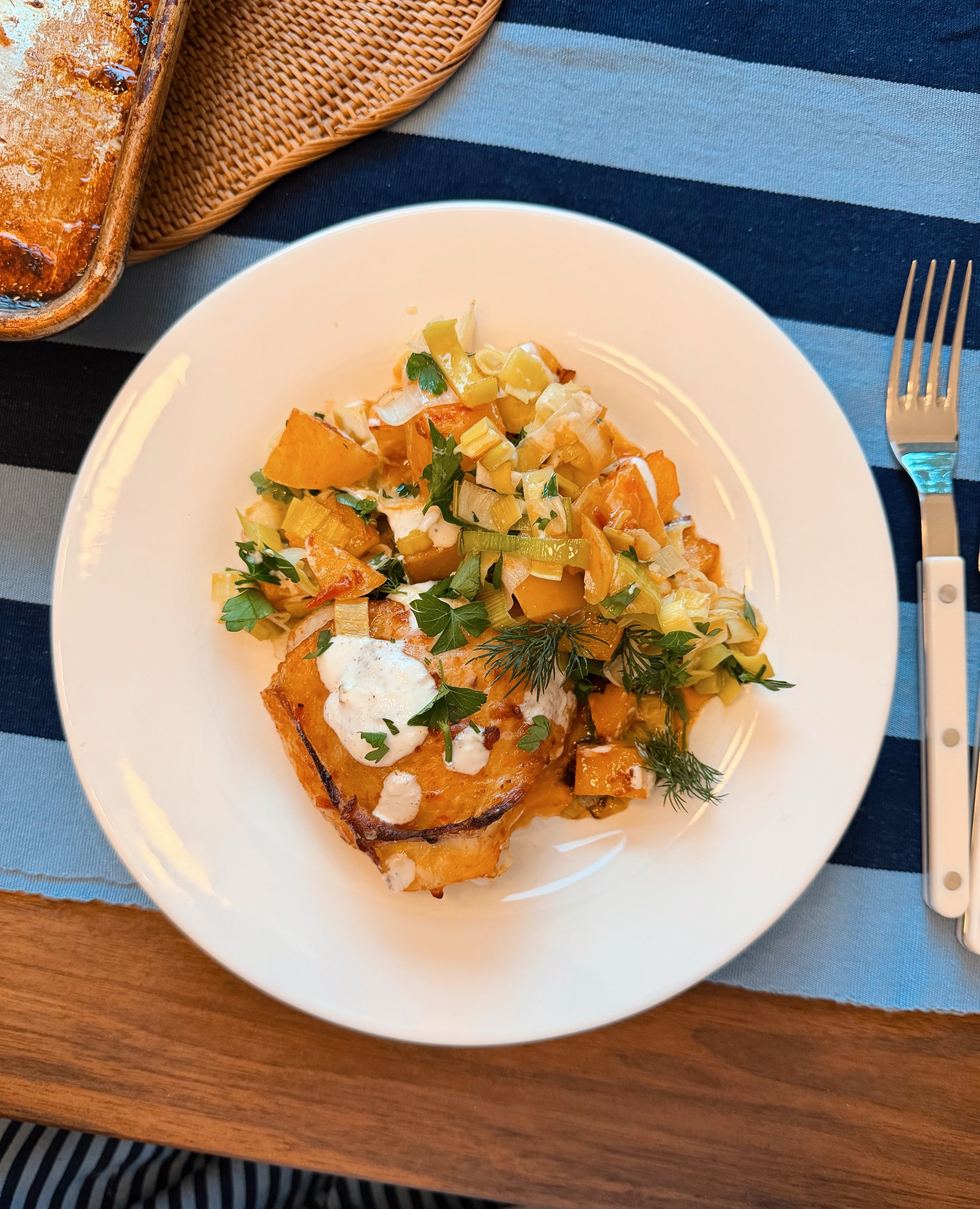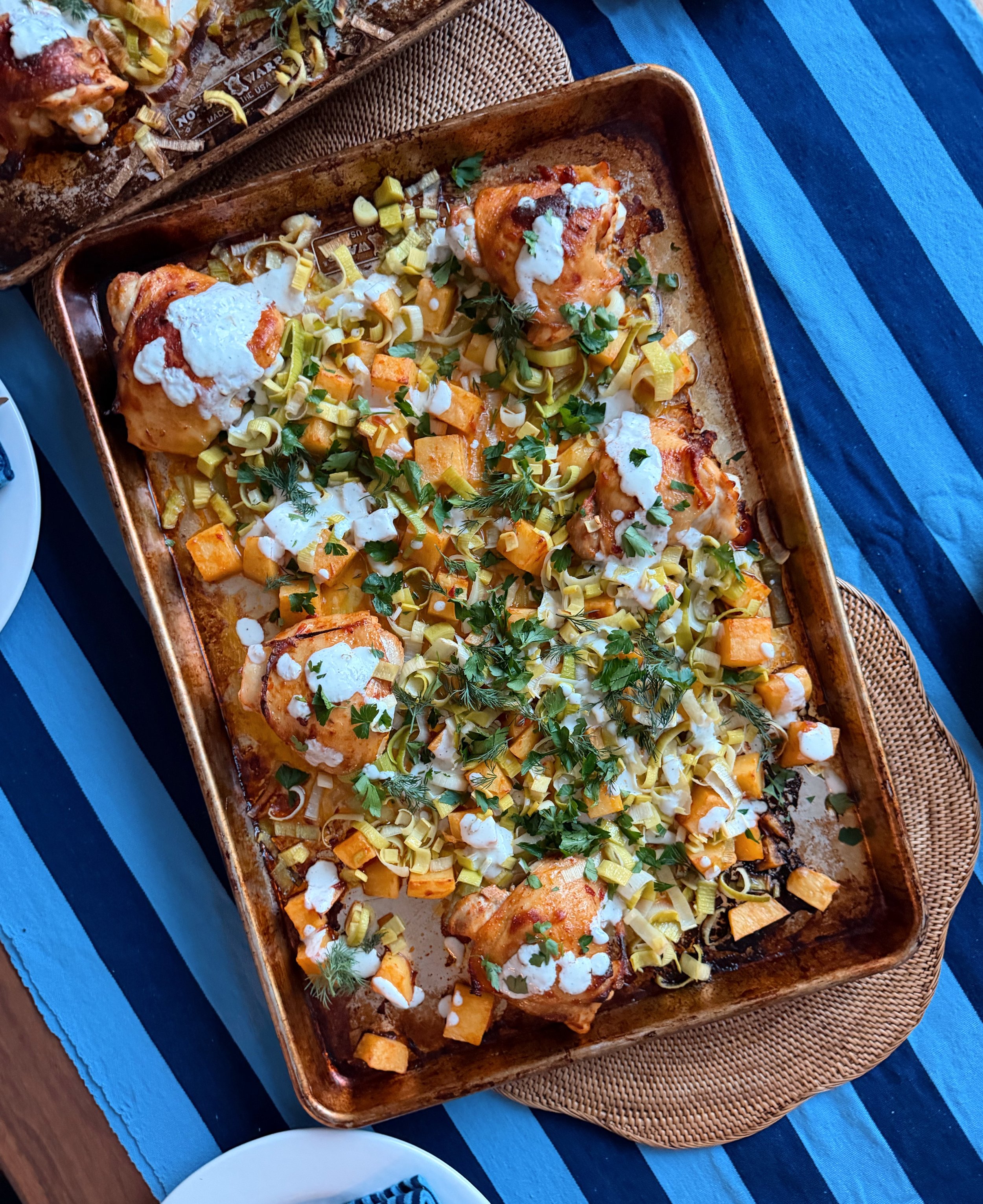 Chicken thighs, leeks, potatoes, harissa, fresh herbs and salted yogurt. Roast the chicken and potatoes first for 20 minutes, then add the leeks and cook for another 20 minutes. Itβs that easy! The fresh herbs and yogurt really balance this dish out.