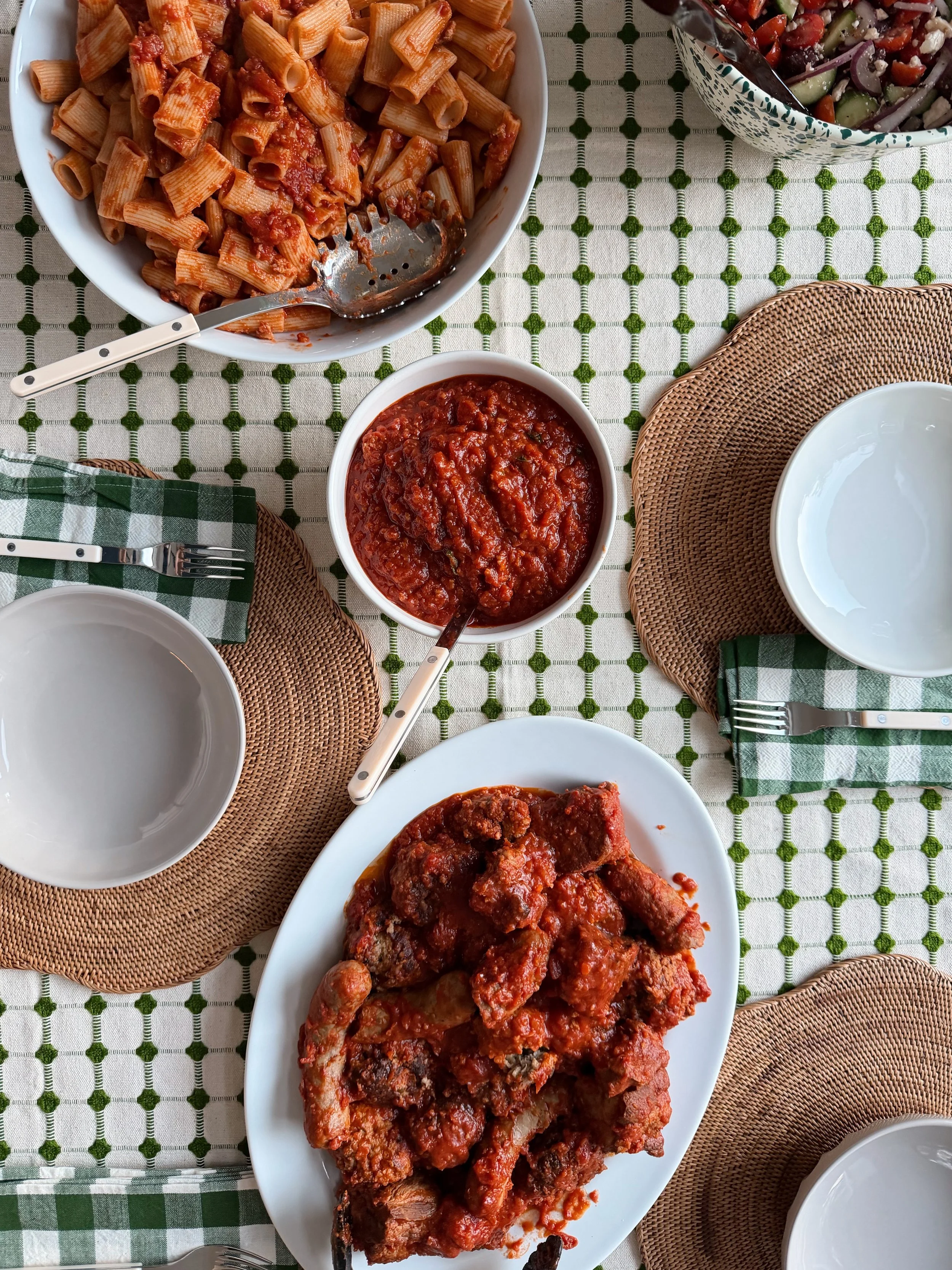 A thick red sauce, needs an acidic, brighter, side kick. I opted for a quick and easy Greek salad featuring cherry tomatoes, English cucumbers, Kalamata olives, red onions (washed to remove their bite) and feta. All topped with a basic vinaigrette (olive oil, red wine vinegar, oregano, salt and pepper).