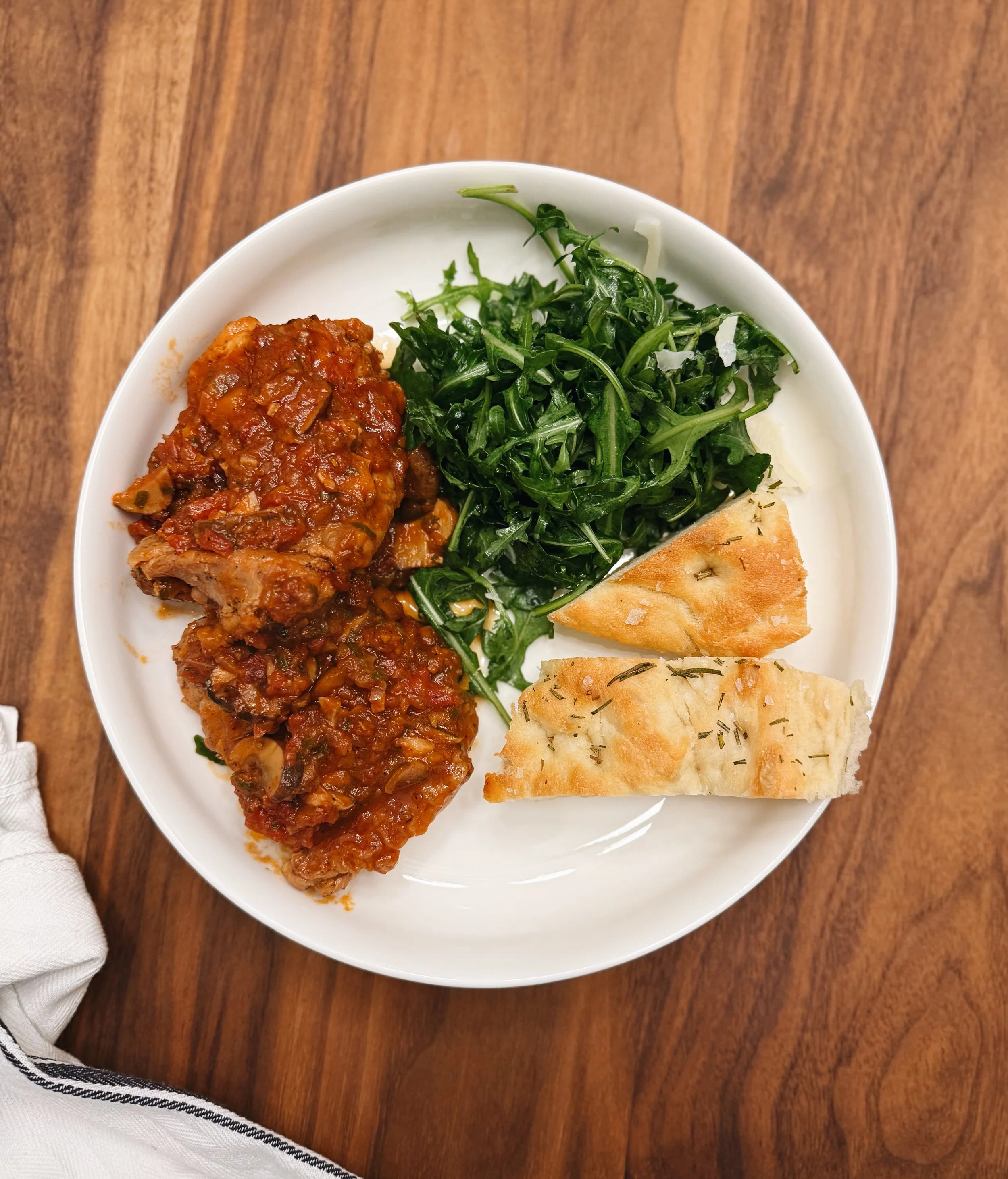 The cacciatore braises in a rich delicious tomato sauce that is begging to have bread dipped into it. So we made my all time favorite focaccia with rosemary and sea salt for dipping.