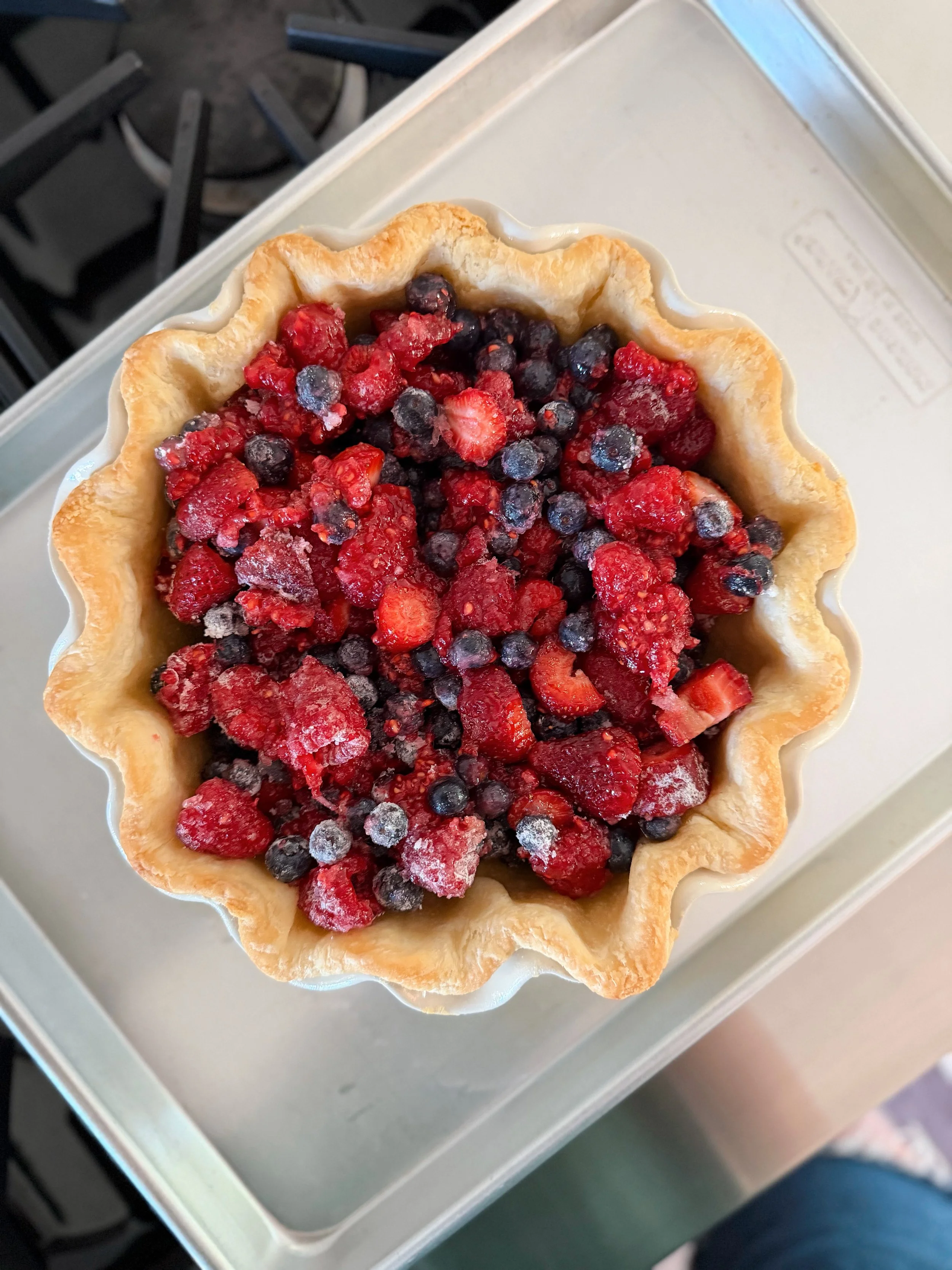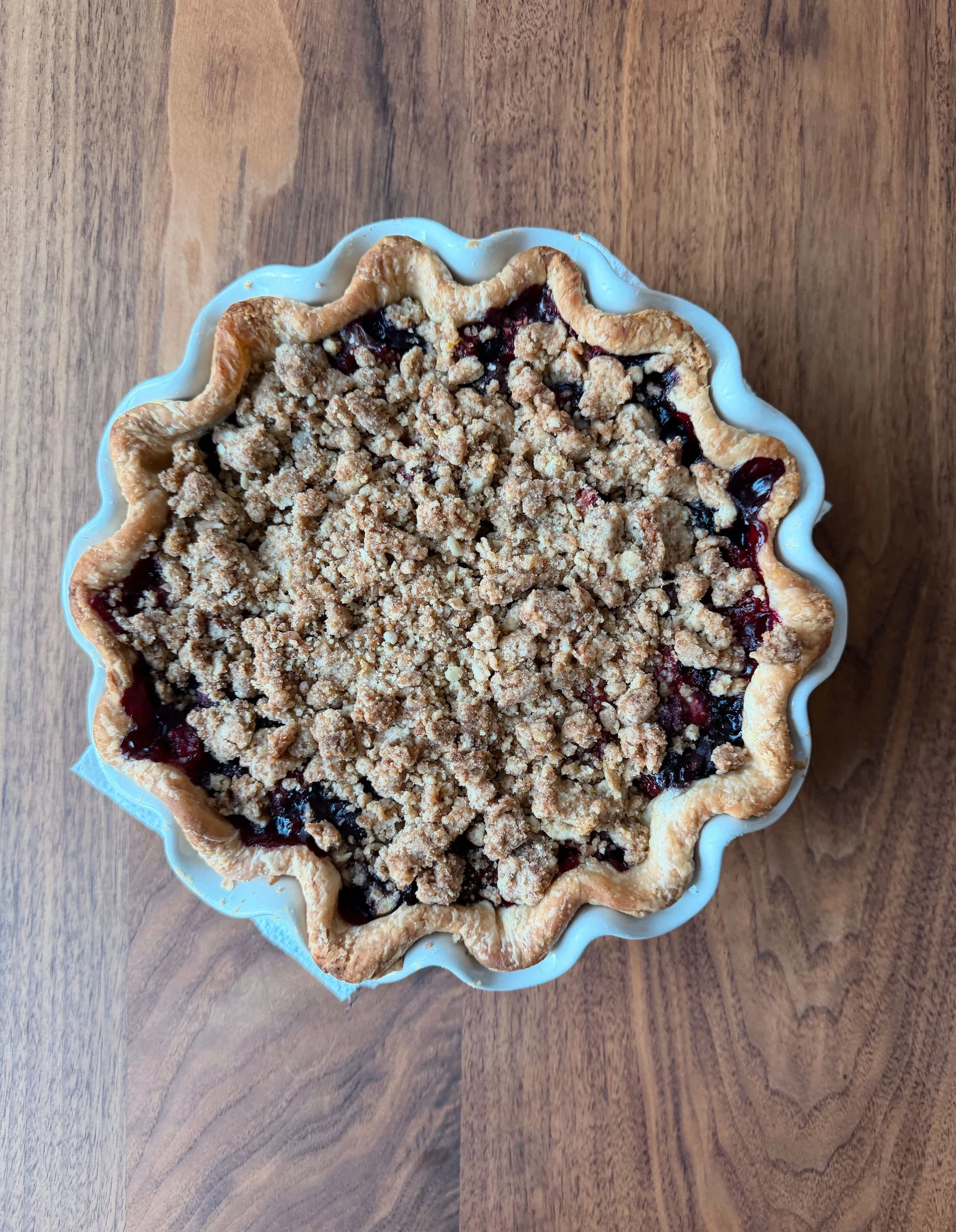 Spring has official sprung so we are starting to see more berries at the farmer’s markets. While they are not exactly at peak season yet, they are tart and delicious. I used raspberries, blueberries and strawberries to make this pie. I used my regular all butter crust for the base, and a crumble topping (very similar to this one from Smitten Kitchen - but I swapped out brown sugar for the granulated sugar because that’s what Amanda’s brother used for an Apple Pie he made for us a few weeks ago that I cannot stop thinking about!).