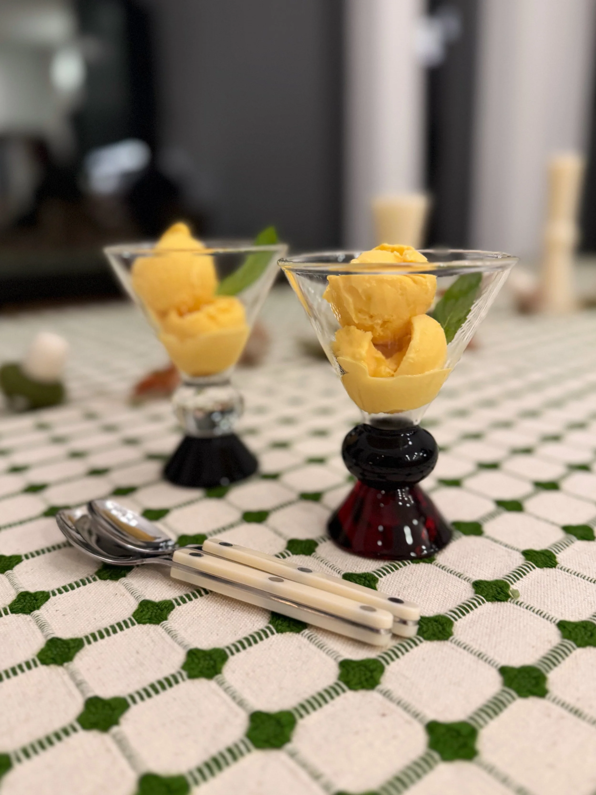 This is what happens when you blend frozen mangoes, and peaches with sweetened condensed milk - you get ice cream! Stupid easy and so delicious - especially when paired with some herbs (mint).