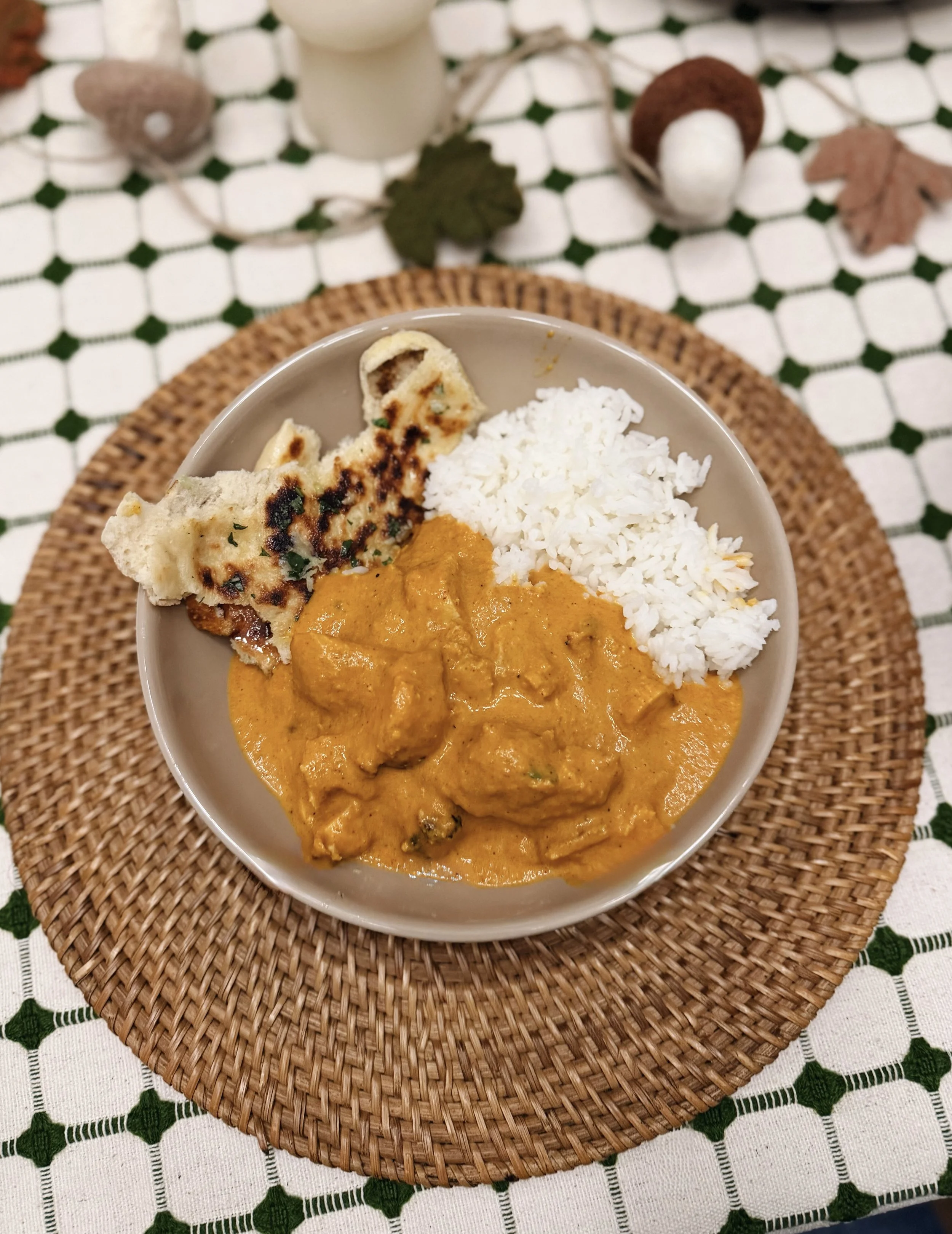 In a total coincidence, ahead of Diwali, this weeks’ theme was Indian! We made our favorite butter chicken with a side of basmati rice and homemade garlic naan. Unrelatedly, we are officially hosting Thanksgiving this year so I have begun to cover the house in seasonal decor (aka pumpkins) 🎃