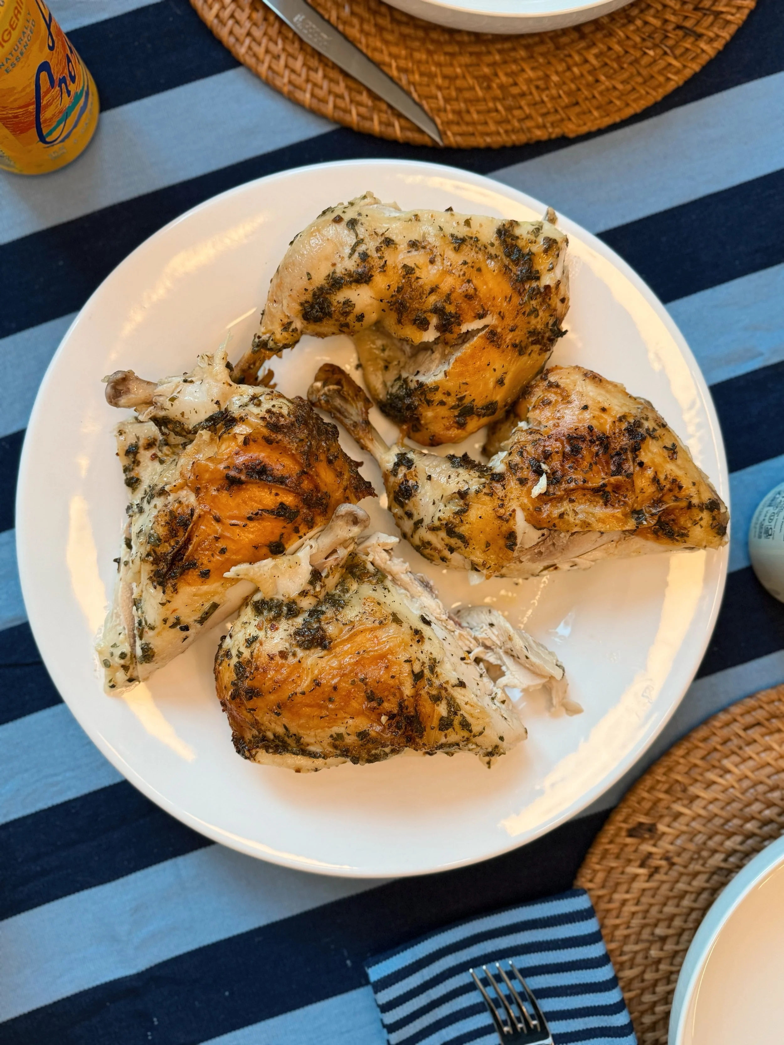 We followed J. Kenjiβs technique of lathering the chicken in mayo before roasting. We also added a homemade chimichurri to the mayo for some herbal notes πΏ
