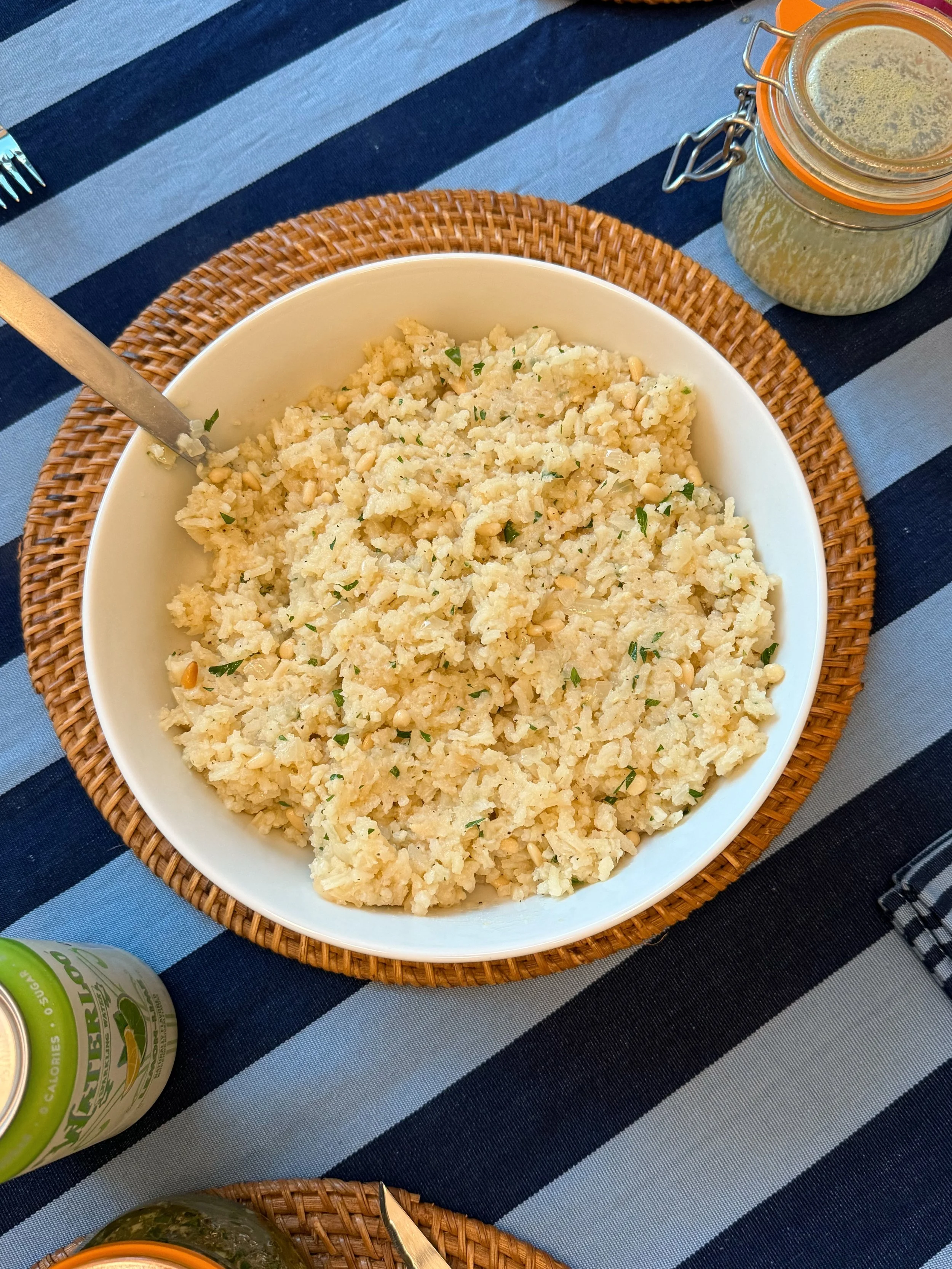 Rice + shallot + garlic + bay leaf cooked in chicken broth with some pine nuts added at the end. Such an easy and simple way to serve boring rice.
