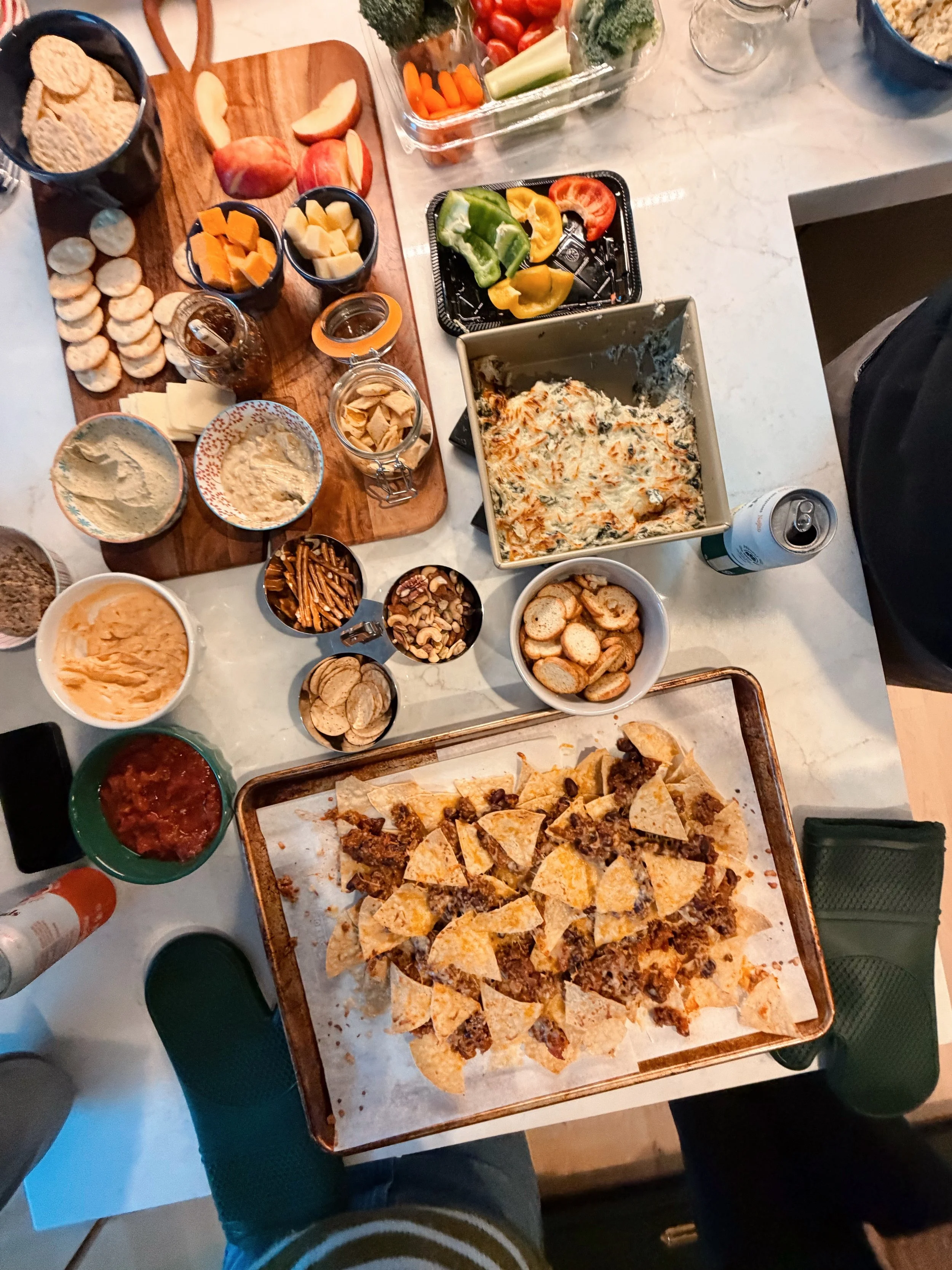Itβs Super Bowl Sunday! We had plans to serve chili, nachos topped with said chili and fried chicken wings. But alas, we all got so full with all the other sides (crackers, dips, and veggies, we saved the wings for later in the week!)